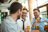 Funny conversation four businessmen while sit pub and drinking beer after work