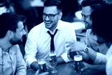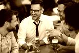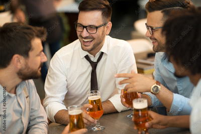 Funny conversation four businessmen while sit pub and drinking beer after work