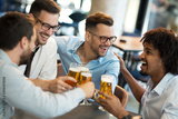 Funny conversation four businessmen while sit pub and drinking beer after work