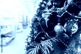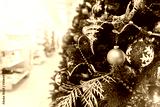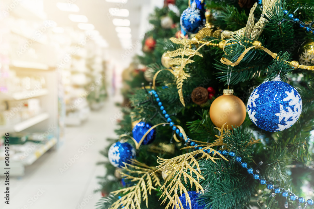 Christmas tree in the store, decorated with balloons, new year's shopping and sales. concept and background for decoration and decoration.