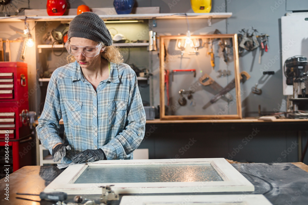Carpenter working on the old wood in a retro vintage workshop.