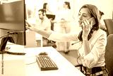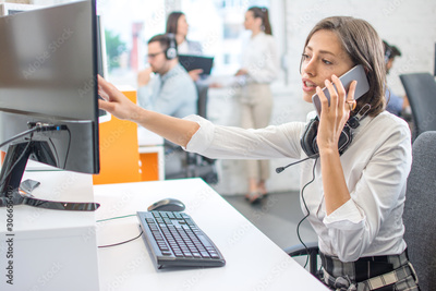 Beautiful young businesswoman talking on mobile phone and checking some data on computer while working in office