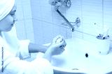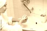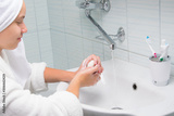 in the bathroom, against the background of a white sink, a girl in a white bathrobe lathers the palms of her hands
