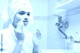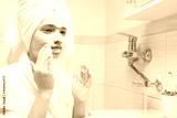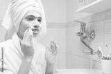 the girl, in a white robe and a towel on her head, in the bathroom, puts foam on her face, for washing, in front of the sink and the tap with water