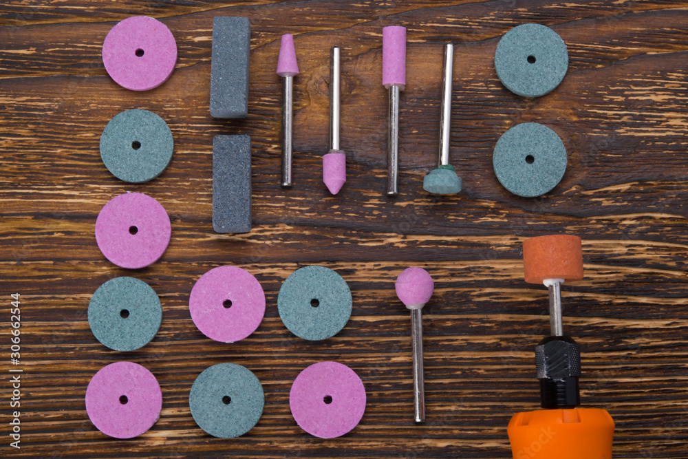 on a dark wooden background, engraving and a set of nozzles made of stone, neatly laid out, for cutting and processing glass and metal