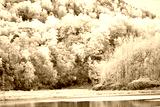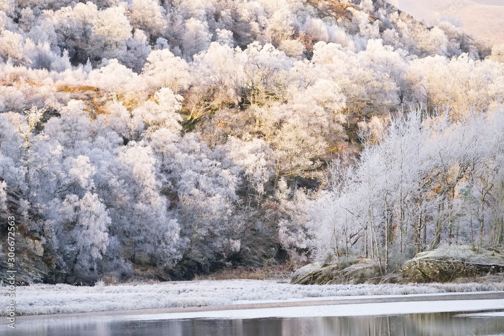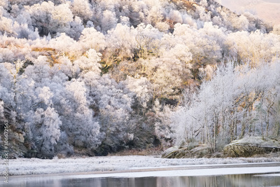 Hoar frost on trees at frozen lake at Loch Dochart Scotland