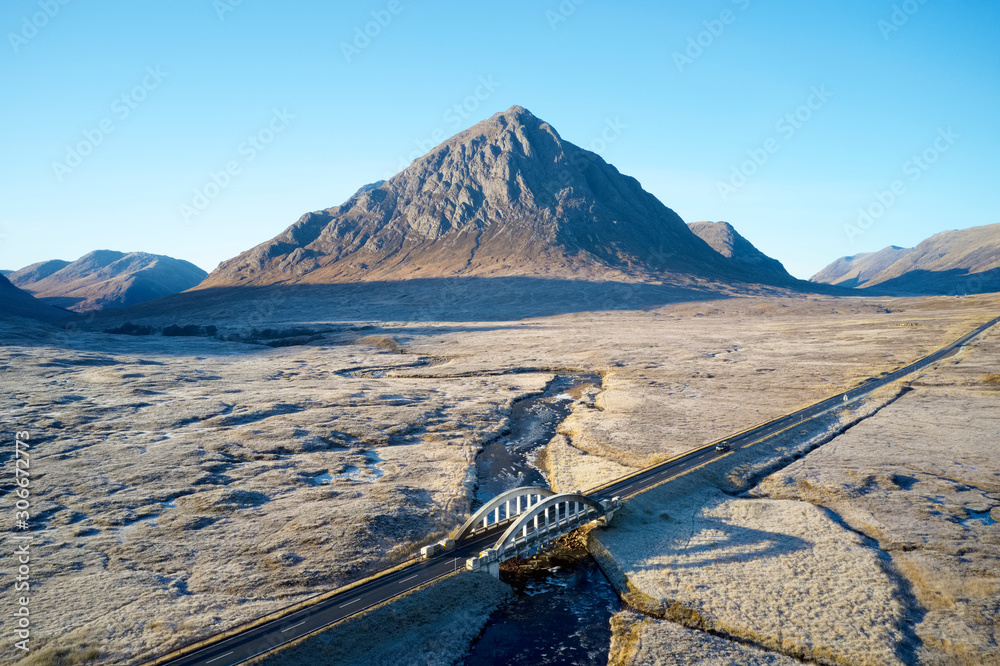 Buachaille Etive Mor in winter frost barren empty moor landscape and road bridge popular for Scottish tourism Scotland uk