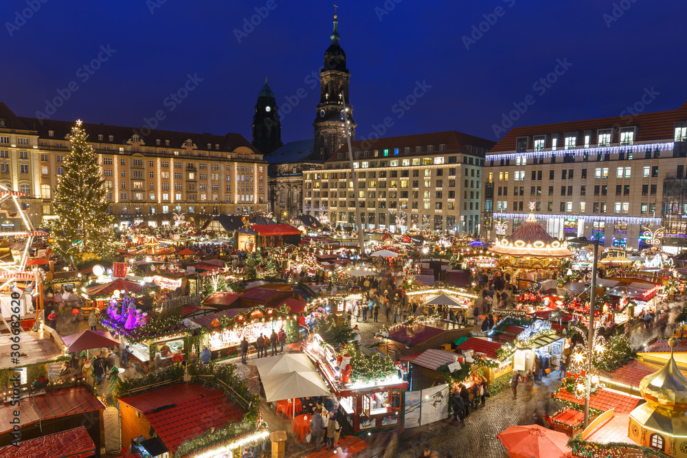 Christmas Market in Dresden, famous traditional European Winter holidays festive activity. Germany, Europe. Christmas vacations background, natural processing photo.