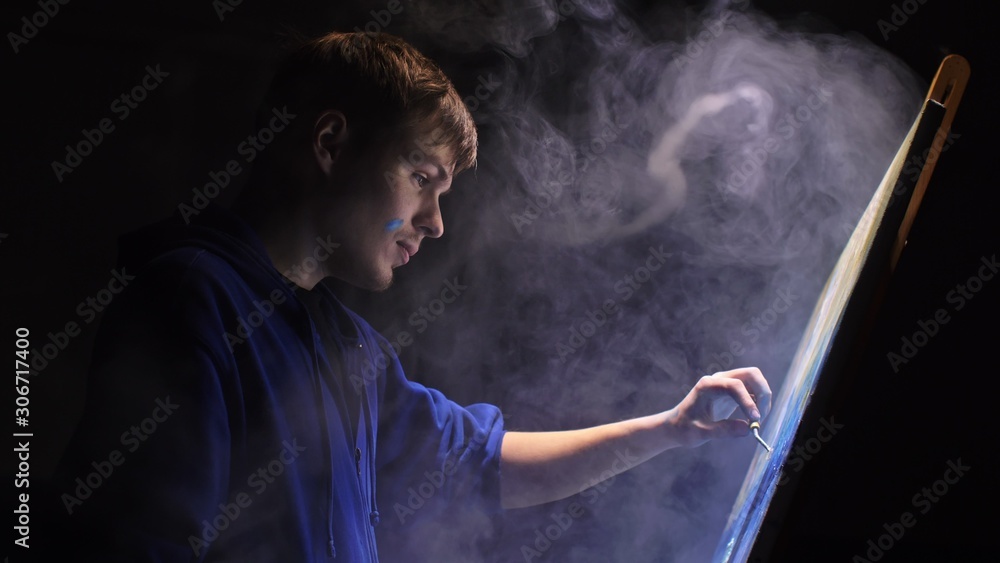 Artist copyist paint seascape with ship in ocean. Vaper smoke vape e-cigarette. Craftsman decorator draw as boat sail on blue sea with acrylic oil color. Draw finger, brush, knife palette. Indoor.