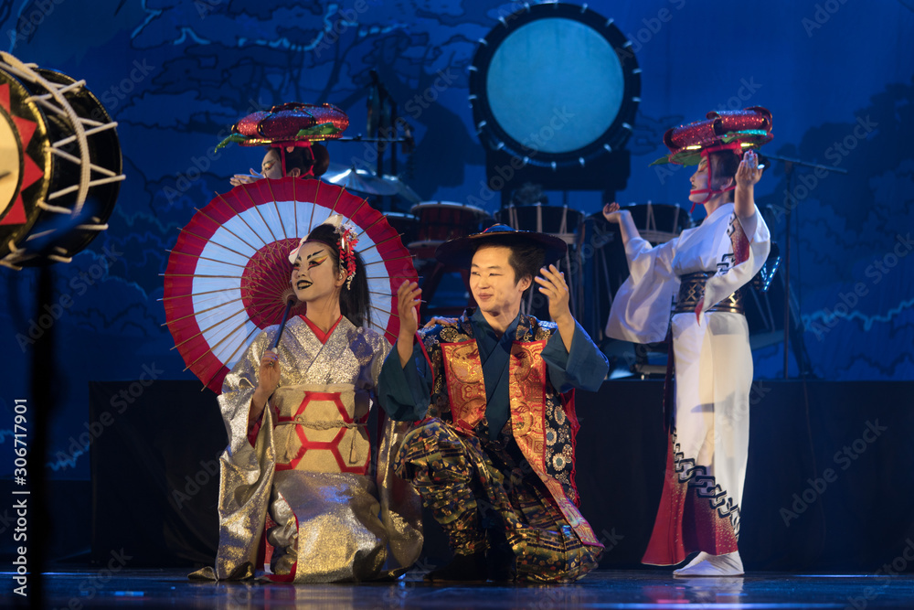 Traditional Japanese performance. Couple in traditional kimono dancing on the stage.