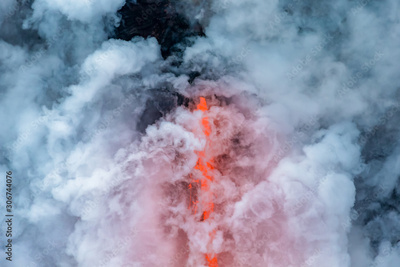 Hot lava reflects orange color on the steam rising from the ocean in Hawaii
