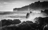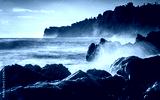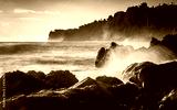Lava rock shoreline with breaking waves at dawn in Hilo, Hawaii
