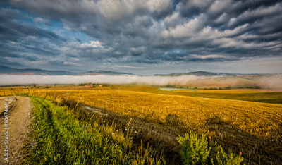 Morning light, wheat fields and mist in Tuscany, Italy-Edit-Edit