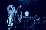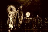 Traditional Japanese performance. Couple in traditional kimono dancing on the stage.
