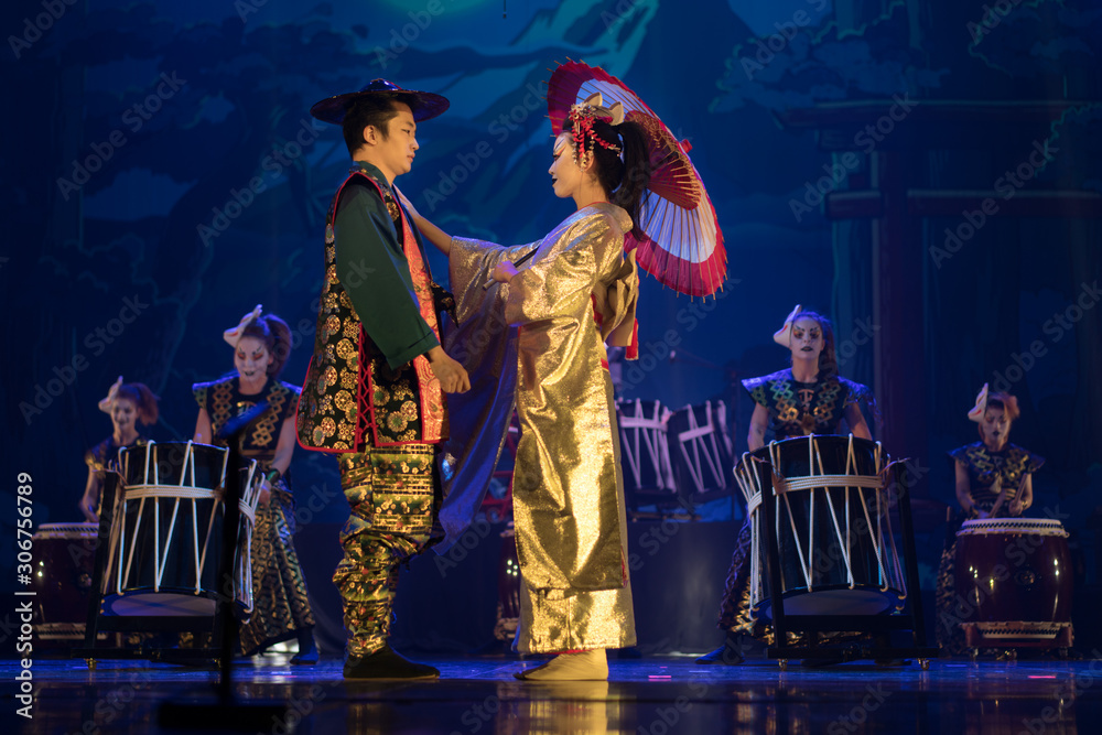 Traditional Japanese performance. Couple in traditional kimono dancing on the stage.