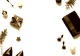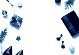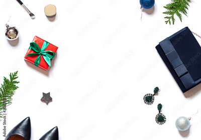 Christmas or New Year fashion party concept frame with clothes and accessories. Preparation for winter holiday events on the white background. Festive shopping composition top view. Copy space