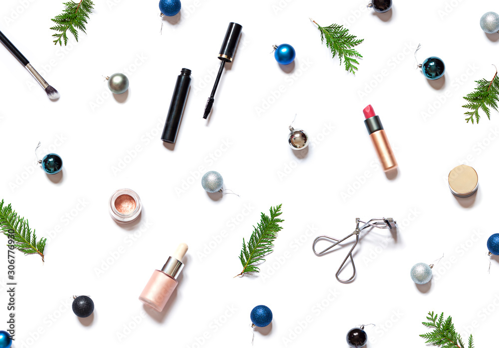 Winter holiday beauty or cosmetic concept pattern on the white background. Shopping make up for Christmas or New Year celebration.