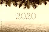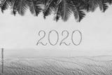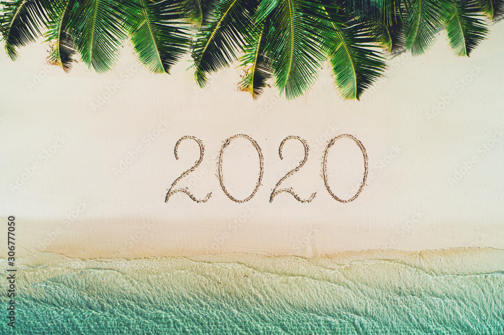 Happy new year concept, 2020 written on the sand. Summer holiday on tropical island. Palm trees and sea waves.
