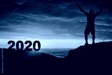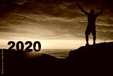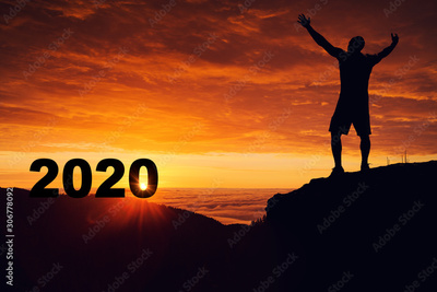 Man silhouette on the mountain top watching the sunrise and 2020 years while celebrating