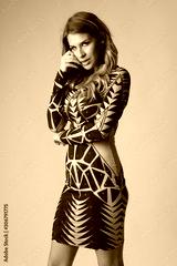 Young beautiful model on grey background. She is wearing nice geometric dress.