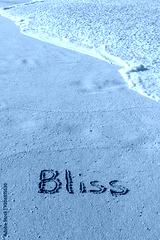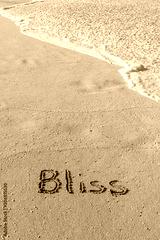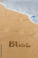 The word Bliss written in the sand on the beach with a wave washing in