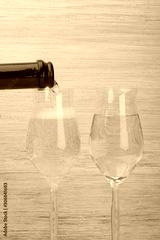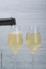 on a light gray background, close-up of two glasses, champagne is pouring from the throat of a bottle