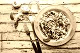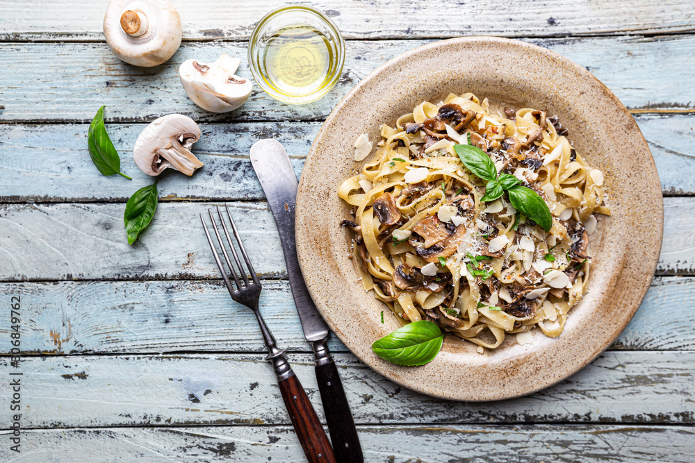 Tagliatelle pasta with mushrooms, cheese and Basil Leaf on the plate, top view