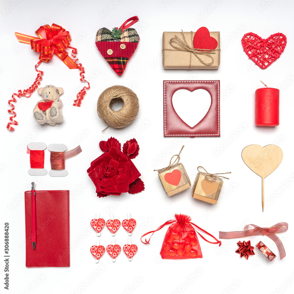 Stylish accessories, decorative items and miniature toys in red color on white background. Empty photoframe, mock up. Greeting card for Valentine's day, love and romance concept. Copy space