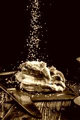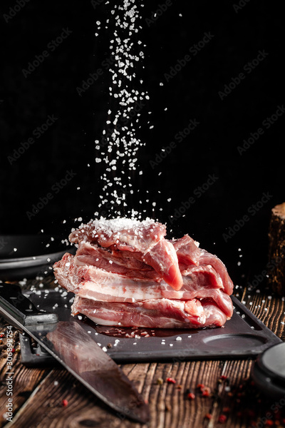 Raw pork meat lies on a cutting board, on a wooden table, next to a kitchen knife. Pickled meat in spices. Background image.