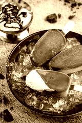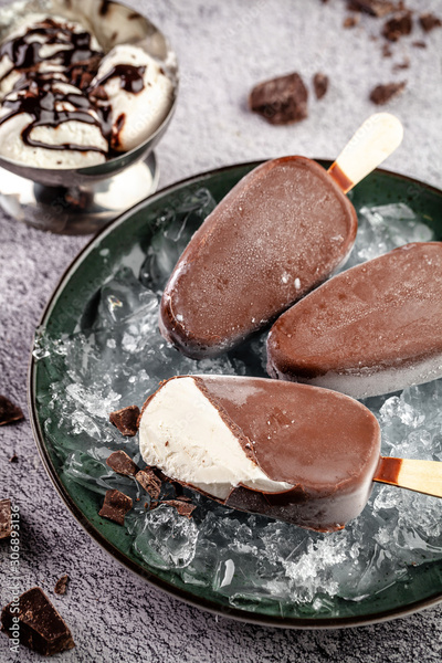 Chocolate popsicle ice-cream on a stick lies on ice in a plate. Background image. copy space