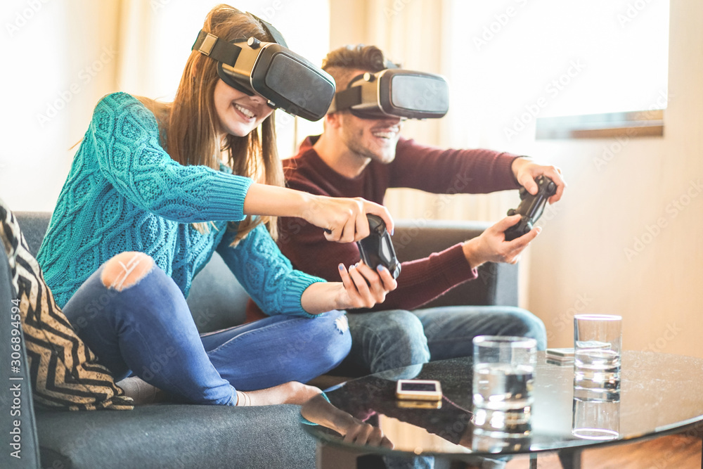 Young millennial couple playing videogames with virtual reality glasses - Happy people having fun with new trends technology - Gaming concept - Focus on woman headset
