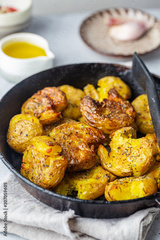 Homemade baked smashed baby potatoes with garlic, salt and herbs