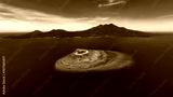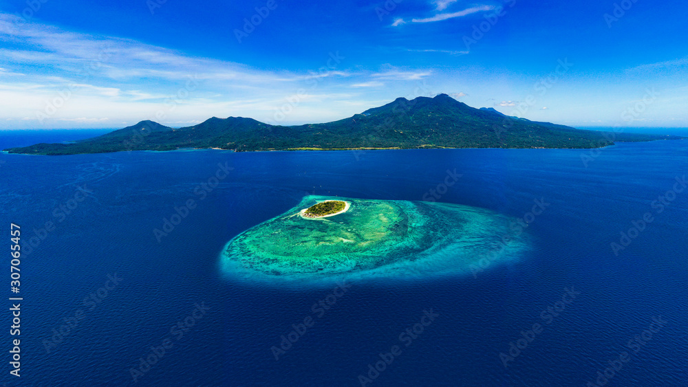 Beautiful Mantigue island with the volcanic Camiguin Island resting behind it while it dwells in the vibrant blue waters of the Philippines.