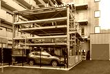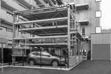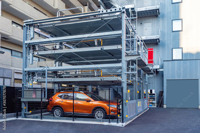 Tokyo. Japan. Multi-storey car parking. Modern parking in Tokyo. Street parking in Japan. Place to store cars. Saving urban space. Robotization. Japan urban. Car stands in an automatic car-park.