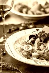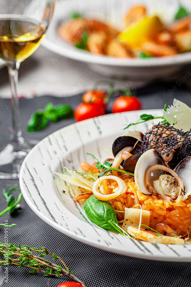 Italian food concept. Risotto with seafood, mussels, octopuses, squid. Serving dishes in a white plate. Modern serving in a restaurant. Background image. Copy space.