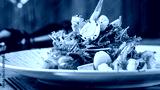Caesar salad with seafood and shrimp. A glass of white wine on the table. Modern serve in a restaurant. Background image. Copy space.