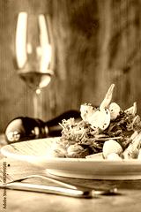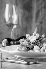 Caesar salad with seafood and shrimp. A glass of white wine on the table. Modern serve in a restaurant. Background image. Copy space.