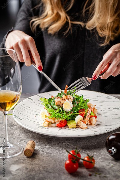 Girl in a restaurant eating Caesar salad with seafood and shrimp. A glass of white wine on the table. Modern serve in a restaurant. Background image. Copy space
