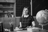 Young smiling woman teacher in classroom, sitting at the table with copybooks