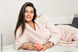 Young smiling woman lying in white bed and using a phone in her bedroom. Happy morning.