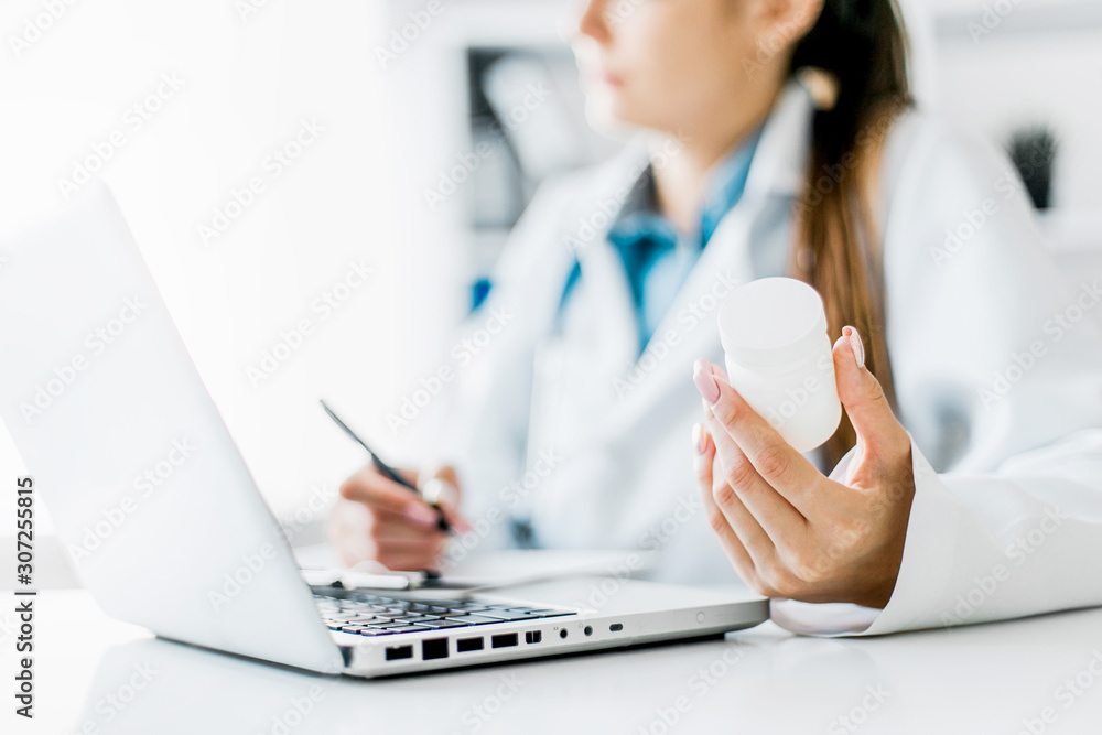 Smiling young female doctor working at the clinic , she is using a computer and writing medical reports.