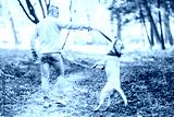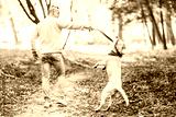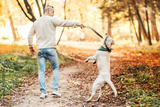Dog labrador execute commands walking with man in the park.