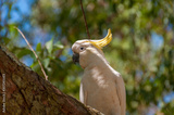White and yellow cockatoo parrot bird sitting on a tree branch