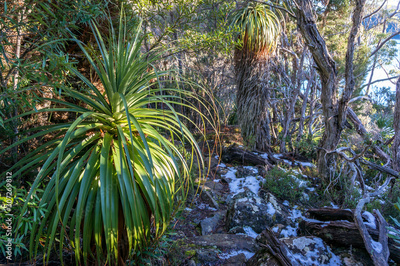 Hiking path, track in the park with evergreen plants and trees and snow