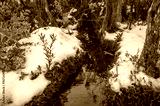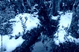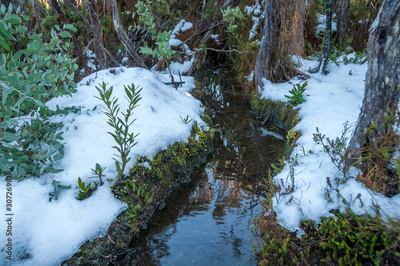 Nature forest landscape with fresh water creek, snow and green plants