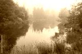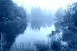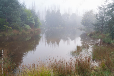 Mystery morning landscape of foggy forest lake at autumn nature background