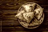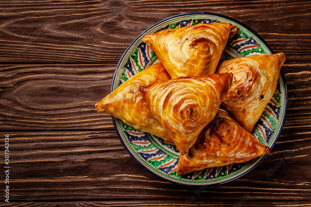 Uzbek national oriental cuisine. Samsa with meat on a wooden background. Background image. Copy space.