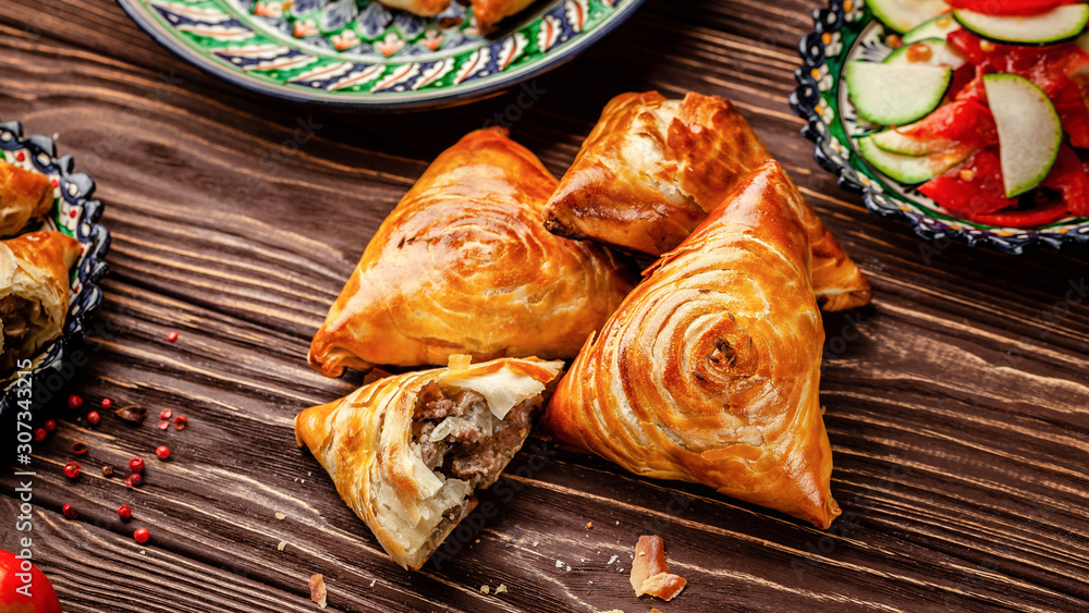Uzbek national oriental cuisine. Samsa with meat on a wooden background. Background image. Copy space.