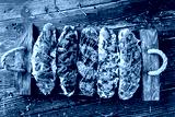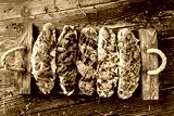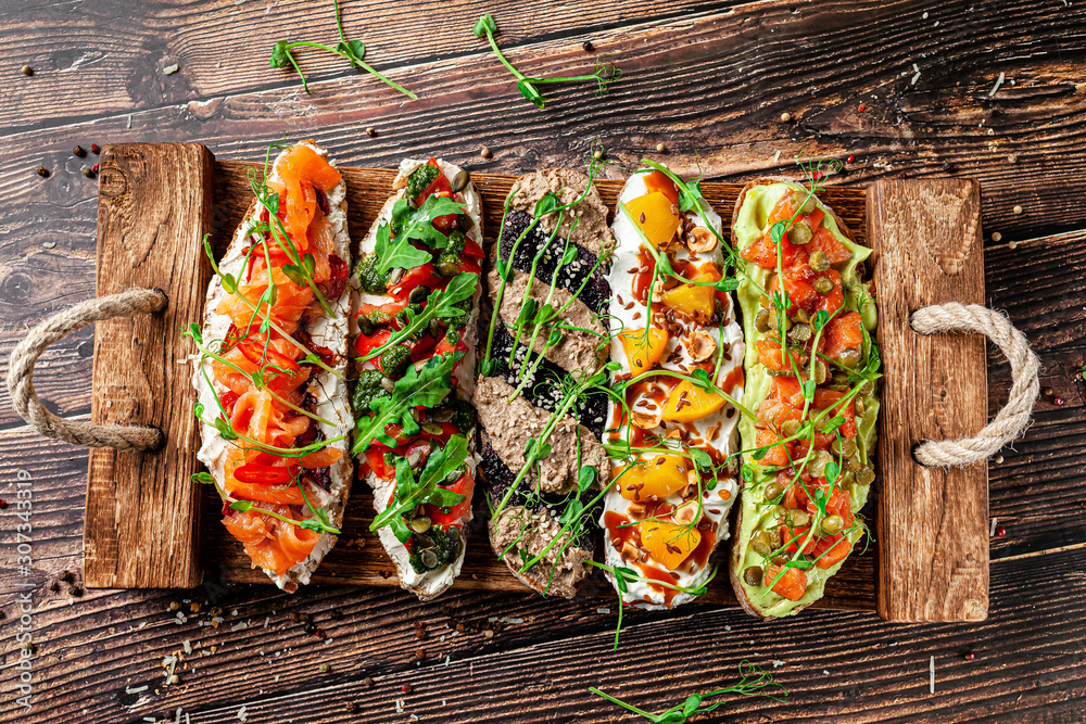 Concept of Spanish cuisine. Tapas Different bruschetta on a fried baguette. Serving dishes in the restaurant. Background image. Copy space.