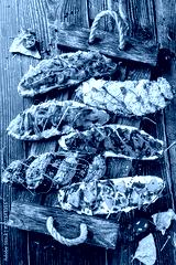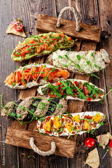 Concept of Spanish cuisine. Tapas Different bruschetta on a fried baguette. Serving dishes in the restaurant. Background image. Copy space.